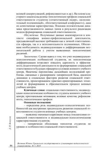 Заключение. Сделан вывод о том, что учет индивидуально-психологических особенностей студентов, их типологическая дифференциация позволяют повысить адресность и эффективность педагогической деятельности по формированию социальной ответственности будущих офицеров в условиях военного учебного центра. Намечены перспективы дальнейших исследований проблемы, связанные с расширением эмпирической базы, анализом динамики и социальных факторов развития социальной ответственности, проектированием практико-ориентированных технологий ее формирования в образовательном процессе военных учебных центров. Основные положения: - определена роль индивидуально-психологических особенностей как внутренних предпосылок развития социальной ответственности студентов военных учебных центров; - выявлены значимые корреляции между показателями социальной ответственности и индивидуально-психологическими характеристиками студентов; - эмпирически обоснована типология студентов по уровню и особенностям социальной ответственности.
