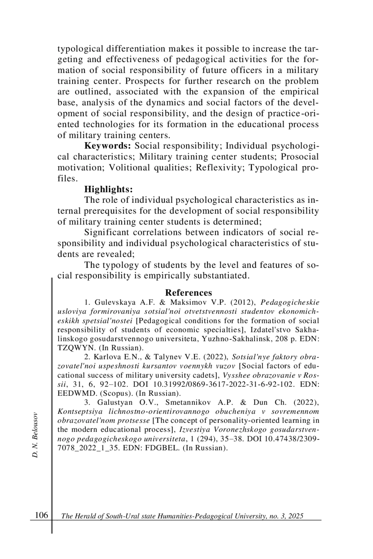 БЕЛОУСОВ Д. Н. ИНДИВИДУАЛЬНО-ПСИХОЛОГИЧЕСКИЕ ОСОБЕННОСТИ СТУДЕНТОВ ВОЕННОГО УЧЕБНОГО ЦЕНТРА И ИХ СВЯЗЬ С УРОВНЕМ СОЦИАЛЬНОЙ ОТВЕТСТВЕННОСТИ // ВЕСТНИК ЮЖНО-УРАЛЬСКОГО ГОСУДАРСТВЕННОГО ГУМАНИТАРНО-ПЕДАГОГИЧЕСКОГО УНИВЕРСИТЕТА. 2025. № 3 (187)