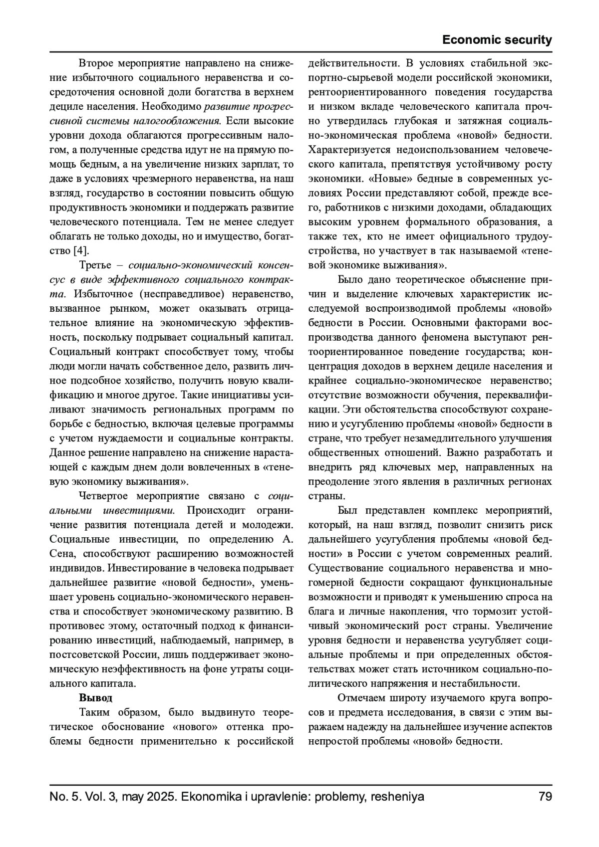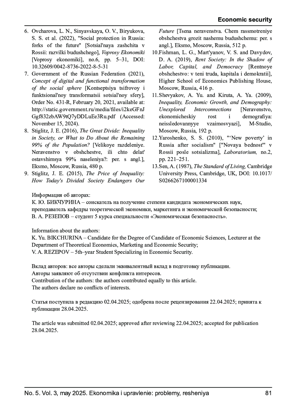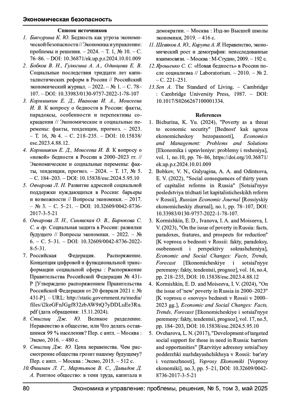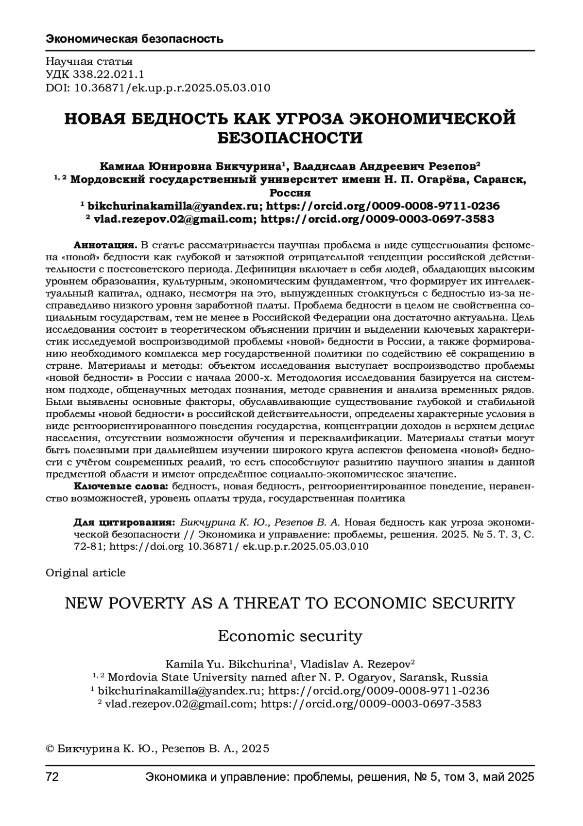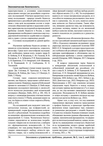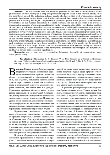 БИКЧУРИНА К. Ю., РЕЗЕПОВ В. А. НОВАЯ БЕДНОСТЬ КАК УГРОЗА ЭКОНОМИЧЕСКОЙ БЕЗОПАСНОСТИ // ЭКОНОМИКА И УПРАВЛЕНИЕ: ПРОБЛЕМЫ, РЕШЕНИЯ. 2025. ТОМ 3 № 5