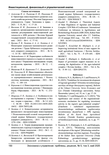 1. Алексеева Н. А., Рыжкова О. И., Пименова Н. Б. Ориентиры инвестиционного развития сельского хозяйства региона // Вестник Удмуртского университета. Серия: Экономика и право. - 2025. - Т. 35, № 1. - С. 17-24. EDN: HOKWGJ