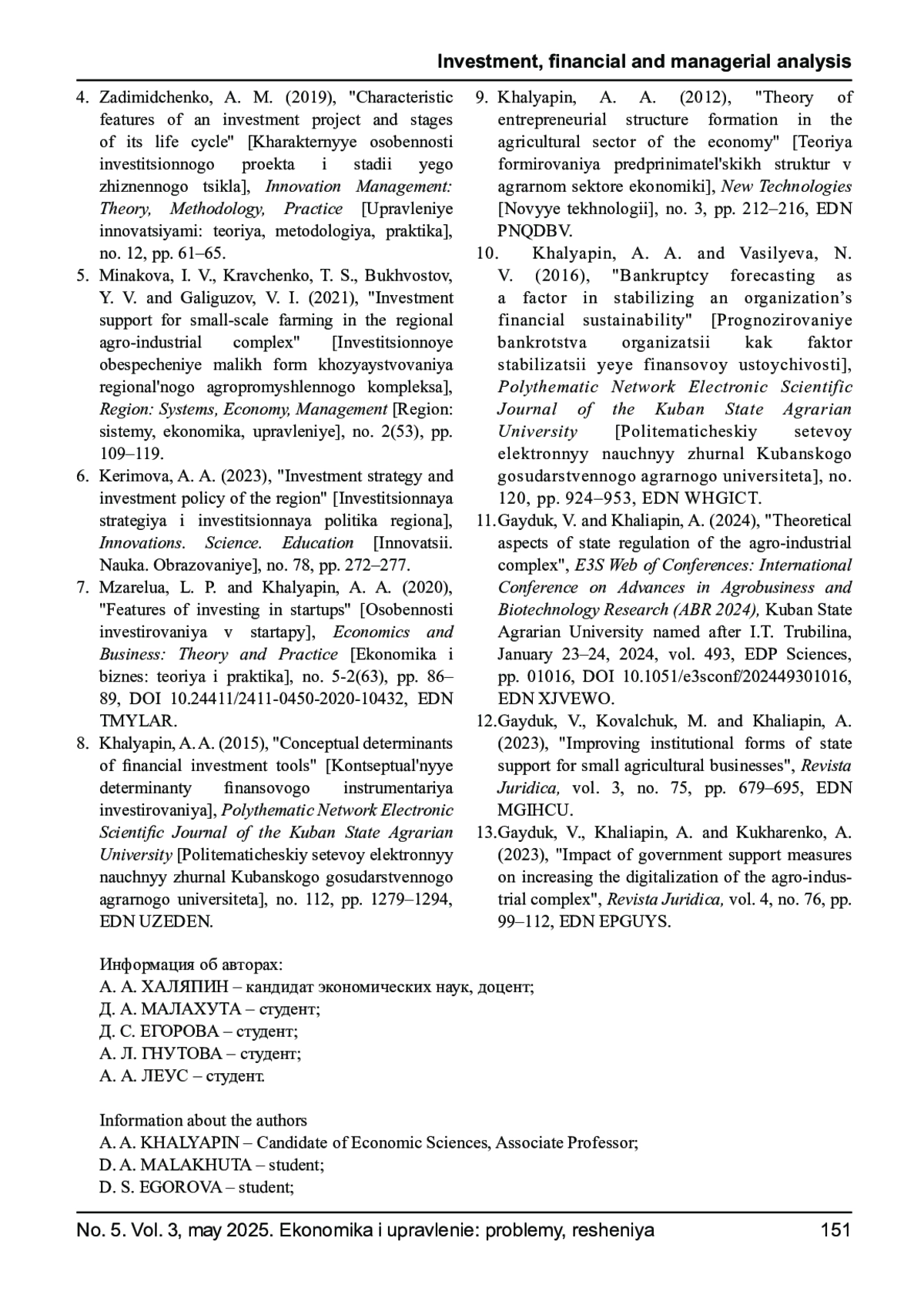 12. Gayduk V., Kovalchuk M., Khaliapin A., et al. Improving institutional forms of state support for small agricultural businesses // Revista Juridica. - 2023. - Vol. 3, No. 75. - P. 679-695. EDN: MGIHCU