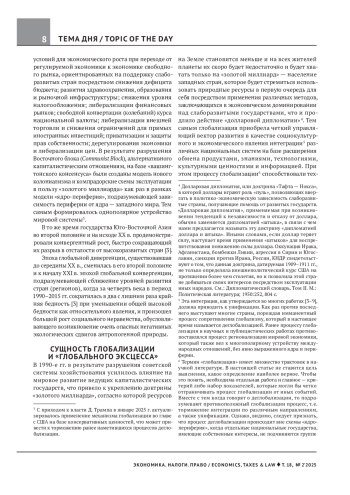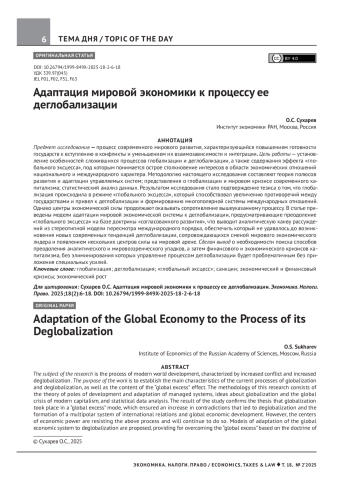 Предмет исследования — процесс современного мирового развития, характеризующийся повышением готовности государств к вступлению в конфликты и уменьшением их взаимозависимости и интеграции. Цель работы — установление особенностей сложившихся процессов глобализации и деглобализации, а также содержания эффекта «глобального эксцесса», под которым понимается острое столкновение интересов в области экономических отношений национального и международного характера. Методологию настоящего исследования составляют теория полюсов развития и адаптации управляемых систем; представления о глобализации и мировом кризисе современного капитализма; статистический анализ данных. Результатом исследования стало подтверждение тезиса о том, что глобализация происходила в режиме «глобального эксцесса», который способствовал увеличению противоречий между государствами и привел к деглобализации и формированию многополярной системы международных отношений. Однако центры экономической силы продолжают оказывать сопротивление вышеуказанному процессу. В статье приведены модели адаптации мировой экономической системы к деглобализации, предусматривающие преодоление «глобального эксцесса» на базе доктрины «согласованного развития», что выводит аналитическую канву рассуждений из стереотипной модели пересмотра международного порядка, обеспечить который не удавалось до возник - новения новых современных тенденций деглобализации, сопровождающихся сменой мирового экономического лидера и появлением нескольких центров силы на мировой арене. Сделан вывод о необходимости поиска способов преодоления аналитического и мировоззренческого упадков, а затем финансового и экономического кризисов капитализма, без элиминирования которых управление процессом деглобализации будет проблематичным без приложения специальных усилий