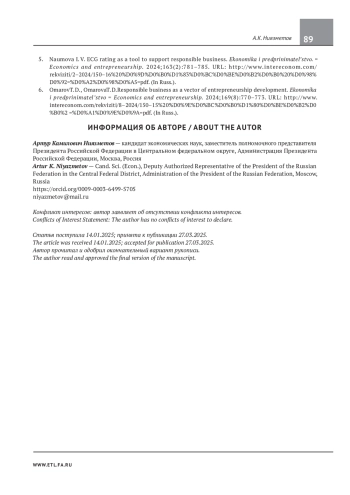 НИЯЗМЕТОВ А. К. НАЦИОНАЛЬНЫЙ СТАНДАРТ ОЦЕНКИ ДЕЛОВОЙ РЕПУТАЦИИ СУБЪЕКТОВ ПРЕДПРИНИМАТЕЛЬСКОЙ ДЕЯТЕЛЬНОСТИ НА ОСНОВЕ ЭКГ-РЕЙТИНГА ОТВЕТСТВЕННОГО БИЗНЕСА И НАПРАВЛЕНИЯ ЕГО РАЗВИТИЯ // ЭКОНОМИКА. НАЛОГИ. ПРАВО. 2025. Т. 18 № 2