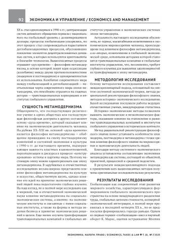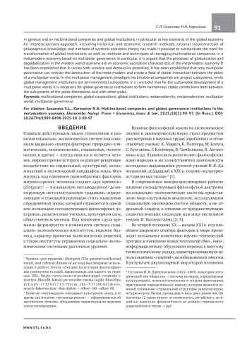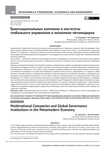 Современной глобальной экономике присущи разнонаправленные тенденции развития, обусловливающие колебания между глобализацией и деглобализацией происходящих в мире политических и экономических процессов. Предмет исследования — влияние состояния социально-экономической системы, характеризующейся колебаниями между двумя противоположностями (модерном и постмодерном) на принимаемые субъектами хозяйственной деятельности решения. Цель работы — выявление особенностей воздействия эпохи метамодерна на экономическую деятельность людей в целом и на транснациональные компании и глобальные институты в частности как ключевые элементы глобальной экономики. Междисциплинарный подход, включающий историко-экономические методы исследования, рациональную реконструкцию философского знания, методы системной экономической теории, позволил обосновать необходимость трансформации глобальных институтов, а также методов и приемов управления транснациональными компаниями в экономике метамодерна на основе многополярного управления. В частности, утверждается, что процессы глобализации и деглобализации в современной мировой экономике являются осцилляцией экономики, характерной для экономики метамодерна. Установлено, что она несет в себе как созидательный, так и разрушительный потенциалы. Определено, что только многополярное управление способно сдерживать деструкцию метамодерна и создавать поле устойчивого взаимодействия полюсов многополярного мира. В парадигме многополярного управления транснациональные компании являются проектными подсистемами, а институты глобального управления — подсистемами среды. Сделаны выводы о том, что для устойчивого развития многополярного мира необходимо, чтобы институты глобального управления формировали гармоничные устойчивые связи как между подсистемами самих полюсов, так и другими полюсами