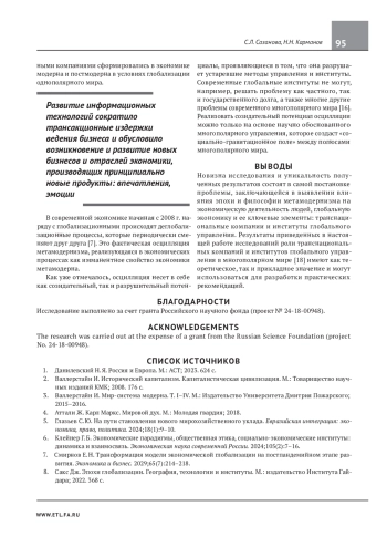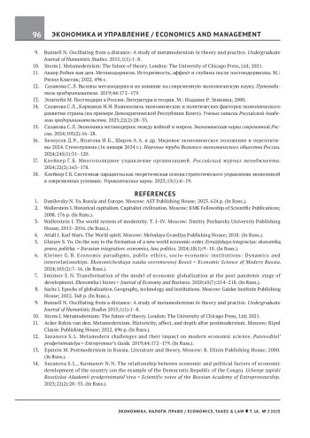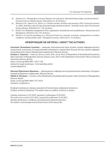 15. Сазанова С. Л. Экономика метамодерна: между войной и миром. Экономическая наука современной России. 2024;105(2):16-28. EDN: URXKEJ