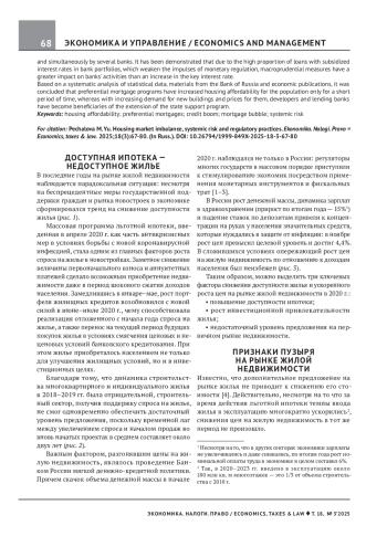 Актуальность статьи обусловлена малоизученностью проблемы ценового дисбаланса на первичном и вторичном рынках жилой недвижимости и потребностью осмысления влияния затянувшихся антикризисных мер в ипотечном сегменте рынка недвижимости на обеспечение доступности жилья, риски банковской системы и регуляторную практику Центрального банка. Предмет исследования — поведение российских банков на рынке ипотечного кредитования в 2020–2024 гг. Цели работы — выявление причин возникновения ценового дисбаланса на первичном и вторичном рынках недвижимости, а также осуществление оценки эффективности макропруденциальных и денежно-кредитных мер регулирования в период действия широкомасштабной программы безадресной льготной ипотеки. На основе проведенного анализа сделаны выводы о том, что, во-первых, программы льготной ипотеки увеличили только на короткий срок доступность жилья для населения, тогда как с ростом спроса на новостройки и цен на них бенефициарами продления программы государственной поддержки стали застройщики и кредитующие банки; во-вторых, кредитный бум и несбалансированный рост цен на строящееся и готовое жилье привели к появлению признаков пузыря на рынке жилой недвижимости; в-третьих, риски в банковских кредитных портфелях начали накапливаться из-за снижения банками первоначального взноса на жилье по ипотеке, вовлечения в ипотечное кредитование высокорискованных групп заемщиков, значительного удлинения сроков кредитования и переоцененных залогов, в-четвертых, одновременное предоставление ипотечным заемщикам дополнительных кредитов другими банками увеличило системный риск; наконец, в-пятых, в условиях уверенного роста темпа инфляции в сочетании с перегревом кредитного рынка высокая доля кредитов с субсидируемой процентной ставкой в банковских портфелях значительно ослабила импульсы монетарного регулирования, и в результате рестриктивные макропруденциальные меры оказались более эффективными, чем повышение ключевой ставки Центральным банком
