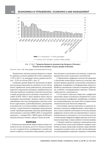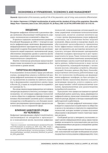 Внедрение цифровых технологий в различные сферы экономики обусловливает необходимость социально-экономических изменений в обществе. В прогнозе социально-экономического развития Российской Федерации до 2036 г.1 отмечается важность цифровизации экономики, формирования информационного пространства как одного из направлений создания благоприятной для жизнедеятельности людей социально-экономической среды, обеспечения повышения уровня и качества жизни населения, дальнейшего укрепления национального технологического суверенитета. Именно техническая революция предоставляет людям новые возможности для повышения их благосостояния и уровня жизни