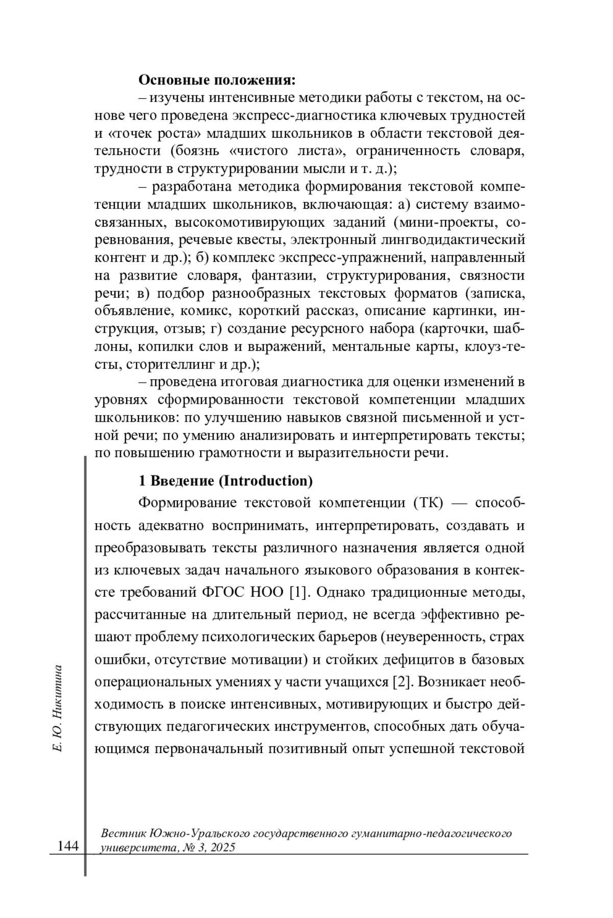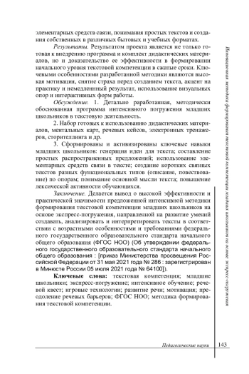 Заключение. Делается вывод о высокой эффективности и практической значимости предложенной интенсивной методики формирования текстовой компетенции младших школьников на основе экспресс-погружения, направленной на развитие умений создавать, анализировать и интерпретировать тексты в соответствии с возрастными особенностями и требованиями федерального государственного образовательного стандарта начального общего образования (ФГОС НОО) (Об утверждении федерального государственного образовательного стандарта начального общего образования: [приказ Министерства просвещения Российской Федерации от 31 мая 2021 года № 286: зарегистрирован в Минюсте России 05 июля 2021 года № 64100]). Основные положения: - изучены интенсивные методики работы с текстом, на основе чего проведена экспресс-диагностика ключевых трудностей и «точек роста» младших школьников в области текстовой деятельности (боязнь «чистого листа», ограниченность словаря, трудности в структурировании мысли и т. д.); - разработана методика формирования текстовой компетенции младших школьников, включающая: а) систему взаимосвязанных, высокомотивирующих заданий (мини-проекты, соревнования, речевые квесты, электронный лингводидактический контент и др.); б) комплекс экспресс-упражнений, направленный на развитие словаря, фантазии, структурирования, связности речи; в) подбор разнообразных текстовых форматов (записка, объявление, комикс, короткий рассказ, описание картинки, инструкция, отзыв; г) создание ресурсного набора (карточки, шаблоны, копилки слов и выражений, ментальные карты, клоуз-тесты, сторителлинг и др.); - проведена итоговая диагностика для оценки изменений в уровнях сформированности текстовой компетенции младших школьников: по улучшению навыков связной письменной и устной речи; по умению анализировать и интерпретировать тексты; по повышению грамотности и выразительности речи.