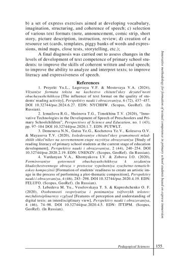 2. Izmailova R.G., Sheinova T.G., Timokhina T.V. (2020), “Innovative Technologies in the Development of Speech of Preschoolers and Primary Schoolchildren”, Perspectives of Science and Education, no. 1 (43), pp. 97-104. DOI: 10.32744/pse.2020.1.7 EDN: PUTWLT