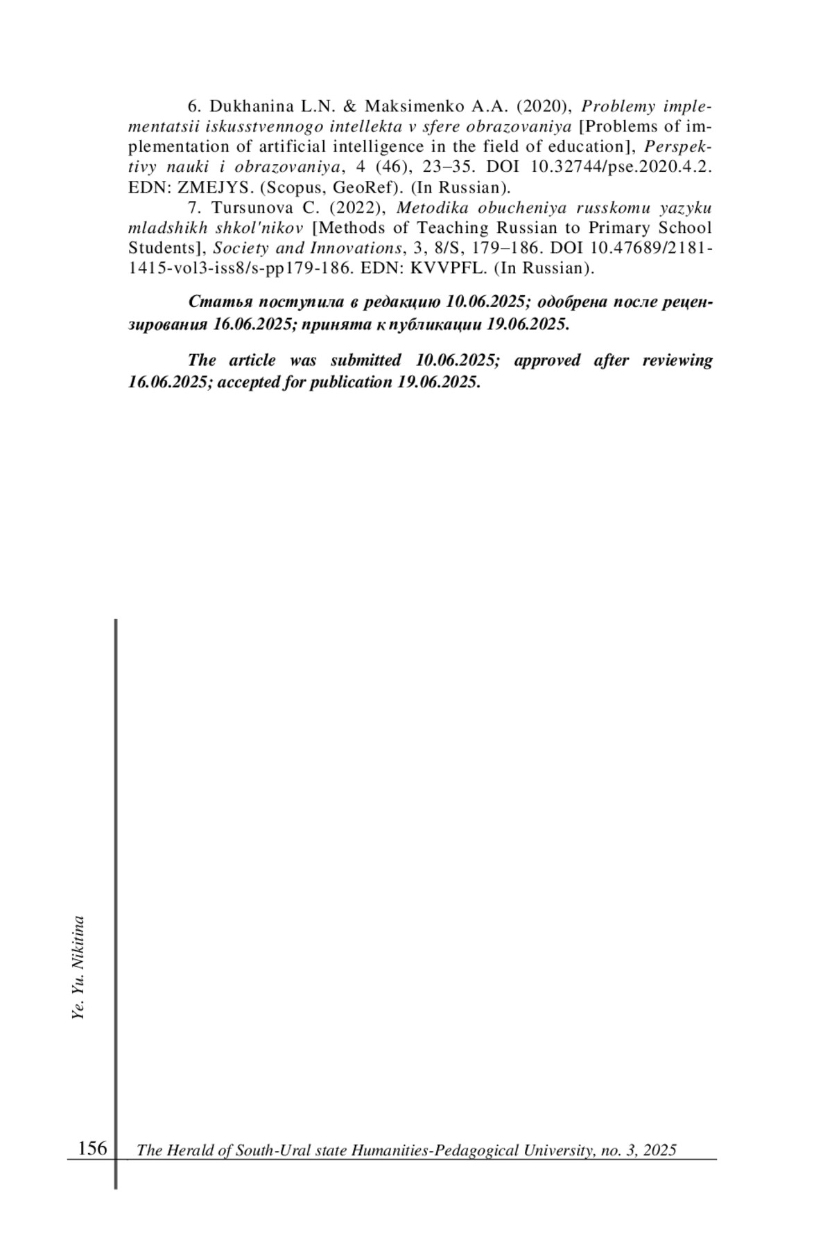 6. Духанина Л. Н., Максименко А. А. Проблемы имплементации искусственного интеллекта в сфере образования // Перспективы науки и образования. 2020. № 4 (46). С. 23-35. 10.32744/pse.2020.4.2. (Scopus, GeoRef). DOI: 10.32744/pse.2020.4.2.Scopus EDN: ZMEJYS
