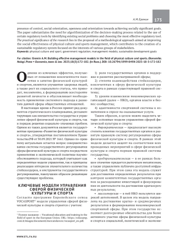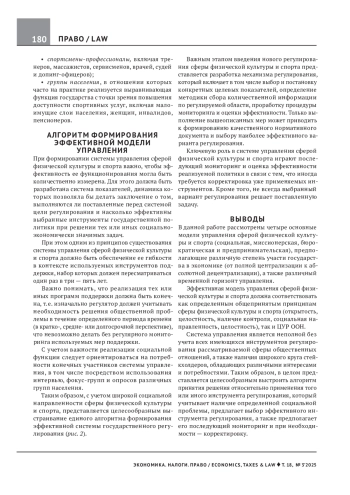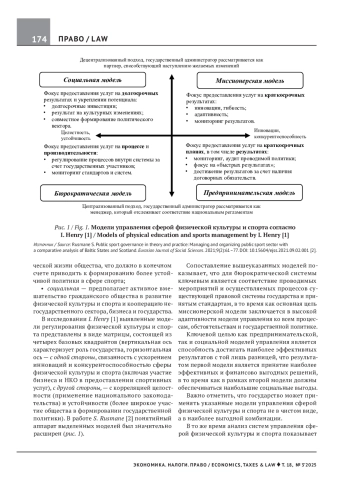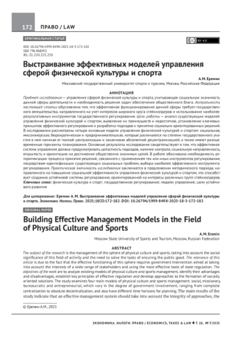 Предмет исследования — управление сферой физической культуры и спорта, учитывающее социальную значимость данной сферы деятельности и необходимость решения задач обеспечения общественного блага. Актуальность настоящей статьи обусловлена тем, что эффективное функционирование данной сферы требует государственного вмешательства, направленного на учет интересов широкого круга стейкхолдеров и использование наиболее результативных инструментов государственного регулирования. Цели работы — анализ существующих моделей управления физической культурой и спортом, выявление их преимуществ и недостатков, установление ключевых принципов эффективного регулирования и разработка подходов к принятию социально ориентированных решений. В исследовании рассмотрены четыре основные модели управления физической культурой и спортом: социальная, миссионерская, бюрократическая и предпринимательская, которые различаются по степени государственного участия в нем начиная от полной централизации и заканчивая абсолютной децентрализацией, а также имеют разные временные горизонты планирования. Основные результаты исследования свидетельствуют о том, что эффективная система управления должна предусматривать целостность подходов, наличие контроля, социальную направленность, открытость и ориентацию на достижение общественно значимых целей. В работе обоснована необходимость алгоритмизации процесса принятия решений, связанного с применением тех или иных инструментов регулирования, посредством идентификации существующих социальных проблем, выбора наиболее эффективного инструмента регулирования. Практическая значимость исследования заключается в предложении методического подхода, на - правленного на повышение социальной эффективности управления физической культурой и спортом, что способствует созданию устойчивой системы регулирования, ориентированной на интересы различных групп стейкхолдеров.