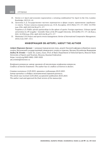 10. Цепелева А. Д. Совершенствование механизма государственно-частного партнерства в сфере услуг физической культуры и спорта: дис. … канд. экон. наук. СПб.; 2015. EDN: YBMLVK