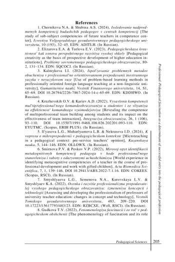 1. Черникова Н. А., Шубина А. С. Исследование надпредметных компетенций будущих педагогов в центрах компетенций // Известия Волгоградского государственного педагогического университета. 2024. № 10 (193). С. 32-45. EDN: ADITLH