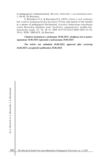 9. Колышева Т. А., Кузьмина Е. С. Голос и речь учителя как средство педагогической фасцинации // Известия Самарского научного центра Российской академии наук. Социальные, гуманитарные, медико-биологические науки. 2021. Т. 23, № 78. С. 38-41. DOI: 10.37313/2413-9645-2021-23-78-38-41 EDN: XBEAUS