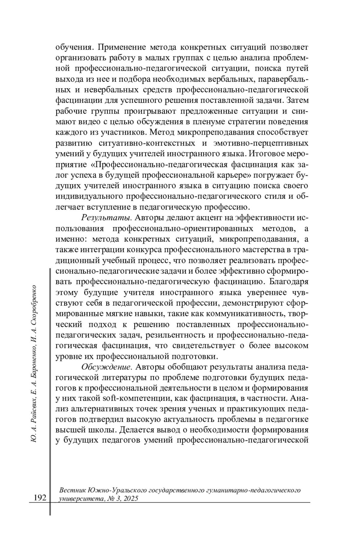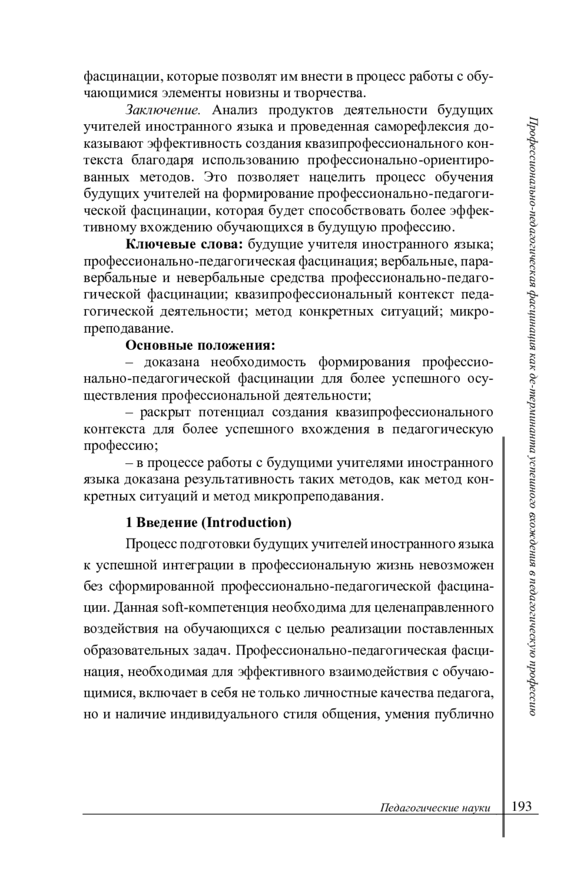 Результаты. Авторы делают акцент на эффективности использования профессионально-ориентированных методов, а именно: метода конкретных ситуаций, микропреподавания, а также интеграции конкурса профессионального мастерства в традиционный учебный процесс, что позволяет реализовать профессионально-педагогические задачи и более эффективно сформировать профессионально-педагогическую фасцинацию. Благодаря этому будущие учителя иностранного языка увереннее чувствуют себя в педагогической профессии, демонстрируют сформированные мягкие навыки, такие как коммуникативность, творческий подход к решению поставленных профессионально-педагогических задач, резильентность и профессионально-педагогическая фасцинация, что свидетельствует о более высоком уровне их профессиональной подготовки.