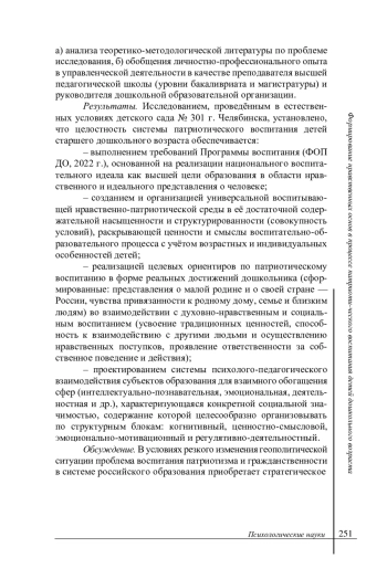 Результаты. Исследованием, проведённым в естественных условиях детского сада № 301 г. Челябинска, установлено, что целостность системы патриотического воспитания детей старшего дошкольного возраста обеспечивается: - выполнением требований Программы воспитания (ФОП ДО, 2022 г.), основанной на реализации национального воспитательного идеала как высшей цели образования в области нравственного и идеального представления о человеке; - созданием и организацией универсальной воспитывающей нравственно-патриотической среды в её достаточной содержательной насыщенности и структурированности (совокупность условий), раскрывающей ценности и смыслы воспитательно-образовательного процесса с учётом возрастных и индивидуальных особенностей детей; - реализацией целевых ориентиров по патриотическому воспитанию в форме реальных достижений дошкольника (сформированные: представления о малой родине и о своей стране - России, чувства привязанности к родному дому, семье и близким людям) во взаимодействии с духовно-нравственным и социальным воспитанием (усвоение традиционных ценностей, способность к взаимодействию с другими людьми и осуществлению нравственных поступков, проявление ответственности за собственное поведение и действия); - проектированием системы психолого-педагогического взаимодействия субъектов образования для взаимного обогащения сфер (интеллектуально-познавательная, эмоциональная, деятельностная и др.), характеризующаяся конкретной социальной значимостью, содержание которой целесообразно организовывать по структурным блокам: когнитивный, ценностно-смысловой, эмоционально-мотивационный и регулятивно-деятельностный.