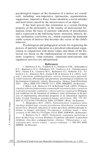 3. Мякишева М. В. Патриотическое воспитание детей старшего дошкольного возраста посредством включения в проектную деятельность // Современные проблемы науки и образования. 2023. № 6. С. 69. DOI: 10.17513/spno.33214 EDN: ZOEWGS
