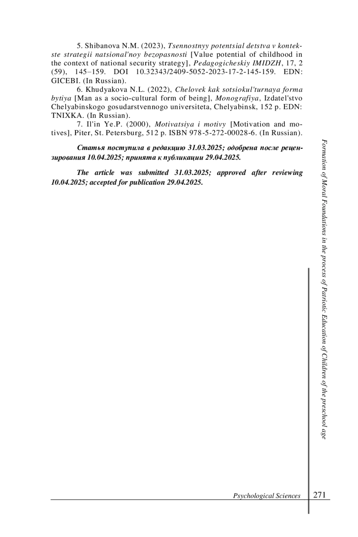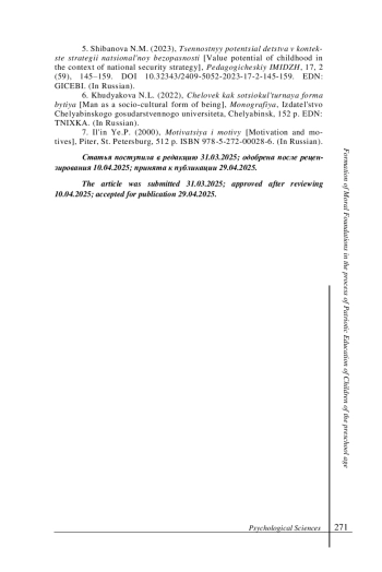 5. Шибанова Н. М. Ценностный потенциал детства в контексте стратегии национальной безопасности // Педагогический ИМИДЖ. 2023. Т. 17, № 2 (59). С. 145-159. DOI: 10.32343/2409-5052-2023-17-2-145-159 EDN: GICEBI