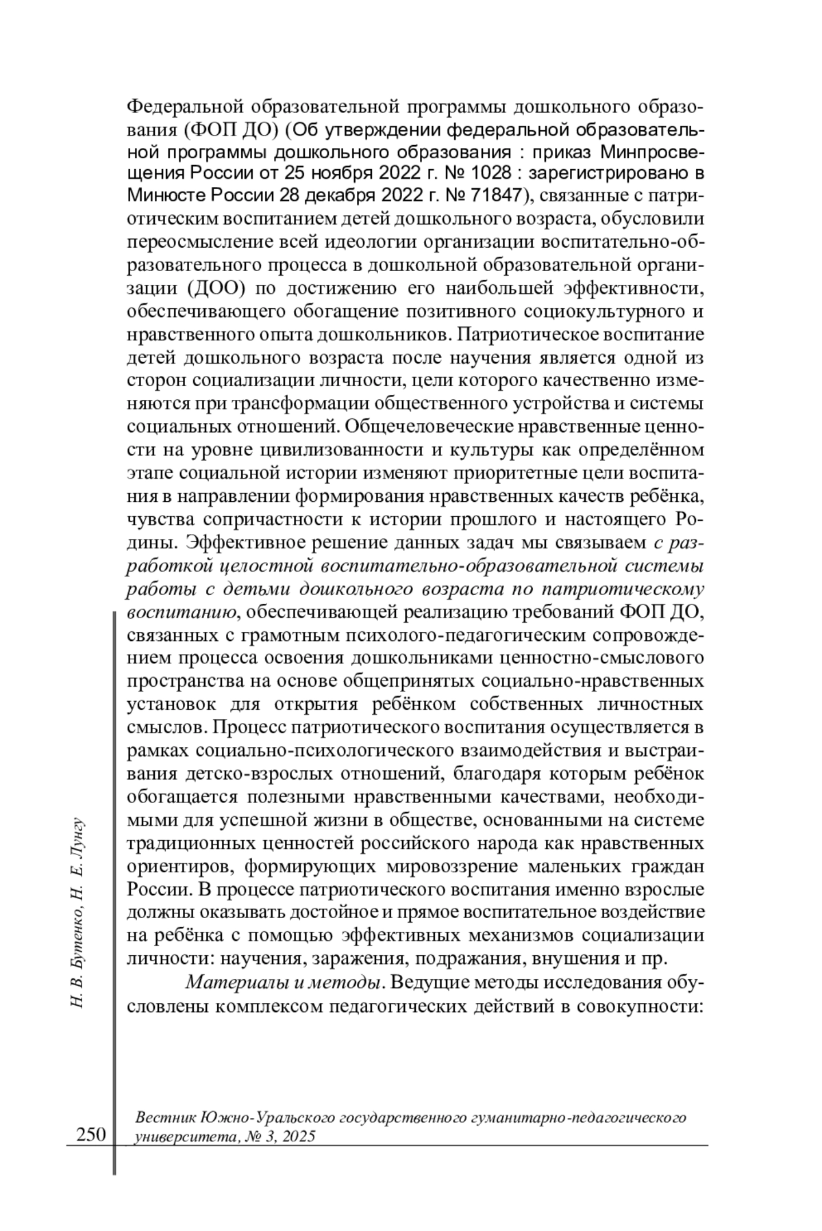 Введение. Современная социокультурная историческая ситуация актуализирует проблему патриотического воспитания детей дошкольного возраста при формировании идеологически-ценностной общности субъектов образования, основанной на гармоничном сочетании нравственных ориентиров и общечеловеческих ценностей, характерных для российской культуры и образования. Формирование и становление нравственной личности в дошкольном возрасте имеет важное воспитательное воздействие на овладение ребенком духовно-социальным опытом и ценностными отношениями как условием воспитания патриотических чувств в становлении основ гражданственности. Существенные изменения, произошедшие в стране за последние годы и новые требования Федеральной образовательной программы дошкольного образования (ФОП ДО) (Об утверждении федеральной образовательной программы дошкольного образования: приказ Минпросвещения России от 25 ноября 2022 г. № 1028: зарегистрировано в Минюсте России 28 декабря 2022 г. № 71847), связанные с патриотическим воспитанием детей дошкольного возраста, обусловили переосмысление всей идеологии организации воспитательно-образовательного процесса в дошкольной образовательной организации (ДОО) по достижению его наибольшей эффективности, обеспечивающего обогащение позитивного социокультурного и нравственного опыта дошкольников. Патриотическое воспитание детей дошкольного возраста после научения является одной из сторон социализации личности, цели которого качественно изменяются при трансформации общественного устройства и системы социальных отношений. Общечеловеческие нравственные ценности на уровне цивилизованности и культуры как определённом этапе социальной истории изменяют приоритетные цели воспитания в направлении формирования нравственных качеств ребёнка, чувства сопричастности к истории прошлого и настоящего Родины. Эффективное решение данных задач мы связываем с разработкой целостной воспитательно-образовательной системы работы с детьми дошкольного возраста по патриотическому воспитанию, обеспечивающей реализацию требований ФОП ДО, связанных с грамотным психолого-педагогическим сопровождением процесса освоения дошкольниками ценностно-смыслового пространства на основе общепринятых социально-нравственных установок для открытия ребёнком собственных личностных смыслов. Процесс патриотического воспитания осуществляется в рамках социально-психологического взаимодействия и выстраивания детско-взрослых отношений, благодаря которым ребёнок обогащается полезными нравственными качествами, необходимыми для успешной жизни в обществе, основанными на системе традиционных ценностей российского народа как нравственных ориентиров, формирующих мировоззрение маленьких граждан России. В процессе патриотического воспитания именно взрослые должны оказывать достойное и прямое воспитательное воздействие на ребёнка с помощью эффективных механизмов социализации личности: научения, заражения, подражания, внушения и пр.
