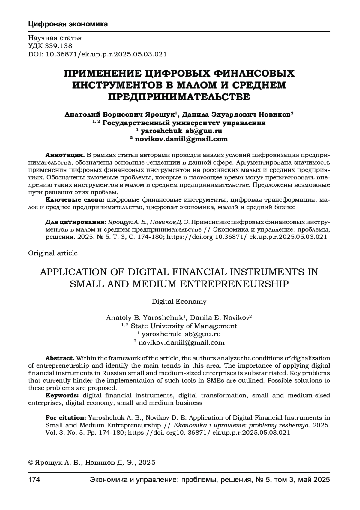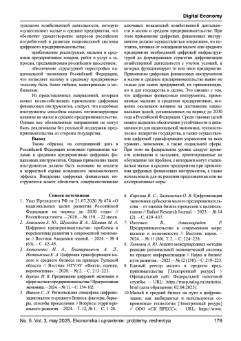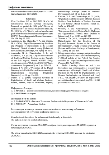 ЯРОЩУК А. Б., НОВИКОВ Д. Э. ПРИМЕНЕНИЕ ЦИФРОВЫХ ФИНАНСОВЫХ ИНСТРУМЕНТОВ В МАЛОМ И СРЕДНЕМ ПРЕДПРИНИМАТЕЛЬСТВЕ // ЭКОНОМИКА И УПРАВЛЕНИЕ: ПРОБЛЕМЫ, РЕШЕНИЯ. 2025. ТОМ 3 № 5