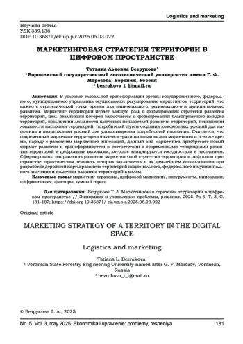 В условиях глобальной трансформации органы государственного, федерального, муниципального управления осуществляют регулирование маркетингом территорий, что важно с стратегической точки зрения для национального, регионального и муниципального развития. Маркетинг территорий играет важную роль в формировании стратегии развития территорий, цель реализации которой заключается в формировании благоприятного имиджа территорий, повышении лояльности ключевых показателей развития территорий, повышении лояльности населения территорий, потребителей путем создания комфортных условий для населения и поддержании условий для удовлетворения потребностей населения. Считается, что современный маркетинг территории является традиционным видом маркетинга и в то же время, наряду с развитием маркетинга инноваций, данный вид маркетинга приобретает новый формат развития и трансформируется в соответствии с современными тенденциями развития территорий и цифровыми вызовами, которые инициируются государством и населением. Сформированы направления развития маркетинговой стратегии территории в цифровом пространстве, практическая ценность которых заключается в их дальнейшем использовании при разработке дорожной карты развития территорий национального, федерального и муниципального значения и политики развития территорий в целом.