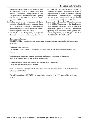 5. Болдырева Т. В., Россинская М. В., Бутырина Ю. А., Минеева Л. Н. Современные маркетинговые инструменты продвижения товаров и услуг // Креативная экономика. - 2025. - Т. 19, № 4. -. DOI: 10.18334/ce.19.4.122957 EDN: BFSDNX
