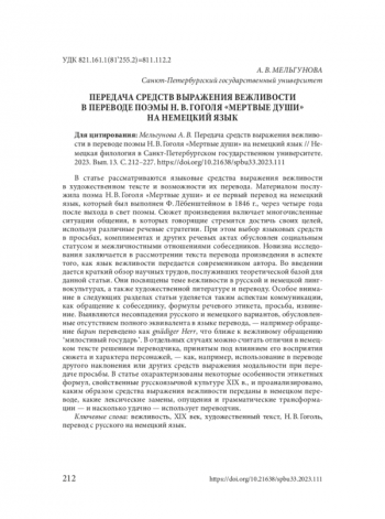 В статье рассматриваются языковые средства выражения вежливости в художественном тексте и возможности их перевода. Материалом послужила поэма Н. В. Гоголя «Мертвые души» и ее первый перевод на немецкий язык, который был выполнен Ф. Лёбенштейном в 1846 г., через четыре года после выхода в свет поэмы. Сюжет произведения включает многочисленные ситуации общения, в которых говорящие стремятся достичь своих целей, используя различные речевые стратегии. При этом выбор языковых средств в просьбах, комплиментах и других речевых актах обусловлен социальным статусом и межличностными отношениями собеседников. Новизна исследования заключается в рассмотрении текста перевода произведения в аспекте того, как язык вежливости передается современником автора. Во введении дается краткий обзор научных трудов, послуживших теоретической базой для данной статьи. Они посвящены теме вежливости в русской и немецкой лингвокультурах, а также художественной литературе и переводу. Особое внимание в следующих разделах статьи уделяется таким аспектам коммуникации, как обращение к собеседнику, формулы речевого этикета, просьба, извинение. Выявляются несовпадения русского и немецкого вариантов, обусловленные отсутствием полного эквивалента в языке перевода, - например обращение барин переведено как gnӓdiger Herr, что ближе к вежливому обращению ʻмилостивый государьʼ. В отдельных случаях можно считать отличия в немецком тексте решением переводчика, принятым под влиянием его восприятия сюжета и характера персонажей, - как, например, использование в переводе другого наклонения или других средств выражения модальности при передаче просьбы. В статье охарактеризованы некоторые особенности этикетных формул, свойственные русскоязычной культуре XIX в., и проанализировано, каким образом средства выражения вежливости переданы в немецком переводе, какие лексические замены, опущения и грамматические трансформации - и насколько удачно - использует переводчик.