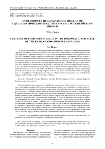 Статья посвящена исследованию употребления предлогов в дипломатическом подстиле русского и китайского языков. Предметом исследования являются структурные и семантические характеристики предложных конструкций, характерных для дипломатического подстиля. Основная цель заключается в сравнительном анализе использования предлогов как одной из языковых особенностей дипломатического подстиля в рассматриваемых языках и выявлении их особенностей в аспектах их структуры и значения. Для достижения данной цели используются методы сопоставительного, статистического и компонентного анализов. В качестве материала исследования выбраны двуязычные дипломатические документы из официальных сайтов Министерства иностранных дел России и Китая за период с 1994 по 2023 год. В результате исследования был сделан вывод, что предлоги активно употребляются как в русском, так и в китайском дипломатическом подстиле, однако их структуры и значения различаются. Выявлено, что с точки зрения значений в обоих языках представлены предложные конструкции для выражения значений целей, способов и оснований. Однако в китайском языке выделяется особая группа предлогов, выражающая субъект или объект действия, в русском же языке такие значения передаются с помощью падежных форм.