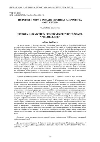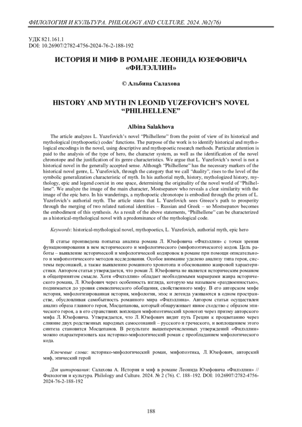 В статье произведена попытка анализа романа Л. Юзефовича «Филэллин» с точки зрения функционирования в нем исторического и мифологического (мифопоэтического) кодов. Цель работы – выявление исторической и мифологической кодировок в романе при помощи описательного и мифопоэтического методов исследования. Особое внимание уделено анализу типа героя, системы персонажей, а также выявлению романного хронотопа и обоснованию жанровой характеристики. Автором статьи утверждается, что роман Л. Юзефовича не является историческим романом в общепринятом смысле. Хотя «Филэллин» обладает необходимыми маркерами жанра исторического романа, Л. Юзефович через особенность взгляда, которую мы называем «раздвоенностью», поднимается до уровня символического обобщения, свойственного мифу. В его авторском мифе история, мифологизированная история, мифология, эпос и легенда уживаются в одном пространстве, обусловливая самобытность романного мира «Филэллина». Автором статьи осуществлен анализ образа главного героя, Мосцепанова, который обнаруживает явное сходство с образом эпического героя, а в его странствиях воплощен мифопоэтический хронотоп через призму авторского мифа Л. Юзефовича. Утверждается, что Л. Юзефович видит путь Греции к процветанию через слияние двух родственных народных самосознаний – русского и греческого, и воплощением этого синтеза становится Мосцепанов. В результате вышеперечисленных утверждений «Филэллин» можно охарактеризовать как историко-мифологический роман с преобладанием мифологического кода.