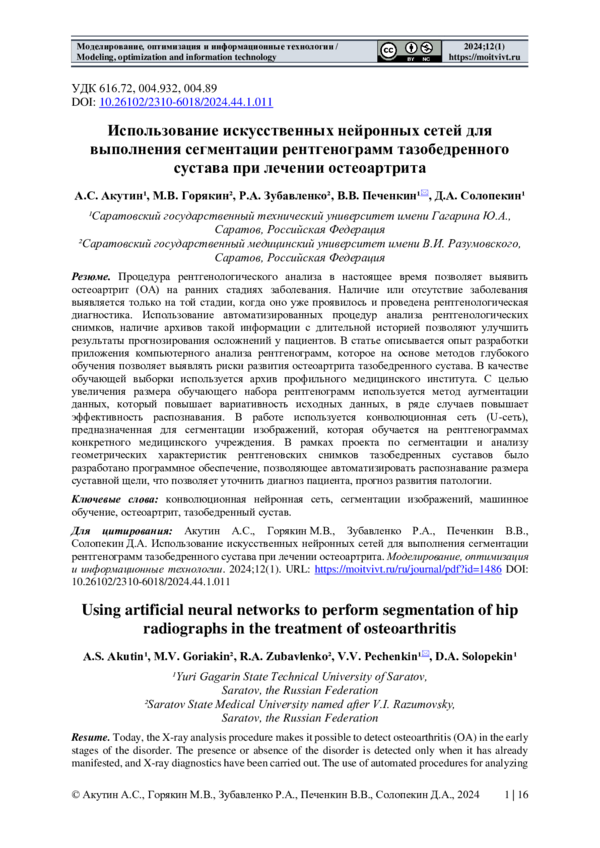Процедура рентгенологического анализа в настоящее время позволяет выявить остеоартрит (ОА) на ранних стадиях заболевания. Наличие или отсутствие заболевания выявляется только на той стадии, когда оно уже проявилось и проведена рентгенологическая диагностика. Использование автоматизированных процедур анализа рентгенологических снимков, наличие архивов такой информации с длительной историей позволяют улучшить результаты прогнозирования осложнений у пациентов. В статье описывается опыт разработки приложения компьютерного анализа рентгенограмм, которое на основе методов глубокого обучения позволяет выявлять риски развития остеоартрита тазобедренного сустава. В качестве обучающей выборки используется архив профильного медицинского института. С целью увеличения размера обучающего набора рентгенограмм используется метод аугментации данных, который повышает вариативность исходных данных, в ряде случаев повышает эффективность распознавания. В работе используется конволюционная сеть (U-сеть), предназначенная для сегментации изображений, которая обучается на рентгенограммах конкретного медицинского учреждения. В рамках проекта по сегментации и анализу геометрических характеристик рентгеновских снимков тазобедренных суставов было разработано программное обеспечение, позволяющее автоматизировать распознавание размера суставной щели, что позволяет уточнить диагноз пациента, прогноз развития патологии.