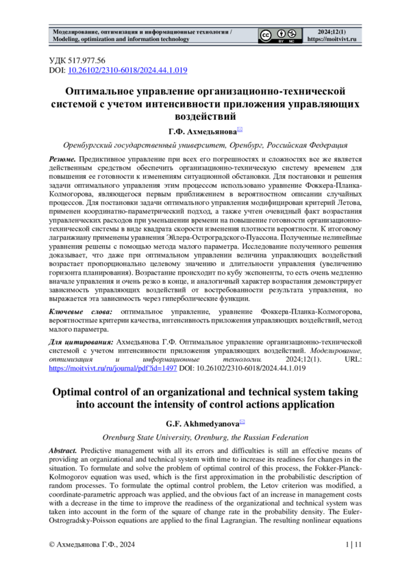 Предиктивное управление при всех его погрешностях и сложностях все же является действенным средством обеспечить организационно-техническую систему временем для повышения ее готовности к изменениям ситуационной обстановки. Для постановки и решения задачи оптимального управления этим процессом использовано уравнение Фоккера-Планка-Колмогорова, являющегося первым приближением в вероятностном описании случайных процессов. Для постановки задачи оптимального управления модифицирован критерий Летова, применен координатно-параметрический подход, а также учтен очевидный факт возрастания управленческих расходов при уменьшении времени на повышение готовности организационно-технической системы в виде квадрата скорости изменения плотности вероятности. К итоговому лагранжиану применены уравнения Эйлера-Остроградского-Пуассона. Полученные нелинейные уравнения решены с помощью метода малого параметра. Исследование полученного решения доказывает, что даже при оптимальном управлении величина управляющих воздействий возрастает пропорционально целевому значению и длительности управления (увеличению горизонта планирования). Возрастание происходит по кубу экспоненты, то есть очень медленно вначале управления и очень резко в конце, и аналогичный характер возрастания демонстрирует зависимость управляющих воздействий от востребованности результата управления, но выражается эта зависимость через гиперболические функции.