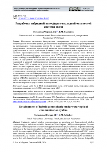Подводные оптические беспроводные коммуникации являются перспективными беспроводными носителями данных для обеспечения подводной деятельности, ориентированной на использование беспроводных систем 5G и выше (5GB). Основными проблемами для развертывания подводных приложений являются физико-химические свойства и сильная турбулентность в канале трансляции. В связи с этим в настоящей работе проводится анализ сквозной производительности гибридной системы атмосферного канала связи (FSO) и подводной беспроводной связи в видимом свете (UVLC) при модуляции интенсивности или прямого обнаружения (IM/DD) в методе с учетом схемы амплитудно-импульсной модуляции (PAM). В ходе данного исследования для решения проблем, связанных с условиями канала с умеренной и сильной турбулентностью используется модель замираний с распределением Гамма-Гамма (GG), а линии связи проектируются путем объединения моделирования плоских волн в соответствующие звенья. Предлагаемые методы работы обеспечивают более высокую достижимую скорость передачи данных с минимальной задержкой отклика, а также улучшает сетевую связь в сценариях мониторинга в реальном времени по сравнению с традиционными технологиями подводной беспроводной связи. Результаты моделирования позволяют достоверно оценить такие показатели производительности системы, как среднее значение частоты битовых ошибок (ABER) и вероятность сбоя (Pout) при наличии ошибок наведения. Наконец, в данной работе используется подход Монте-Карло для наилучшей подгонки кривых и подтверждается численное выражение результатами моделирования.