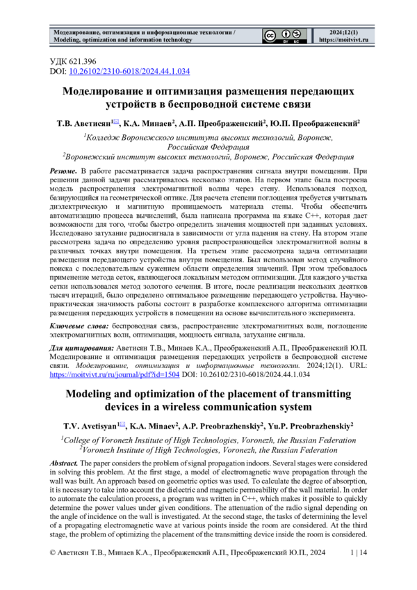 В работе рассматривается задача распространения сигнала внутри помещения. При решении данной задачи рассматривалось несколько этапов. На первом этапе была построена модель распространения электромагнитной волны через стену. Использовался подход, базирующийся на геометрической оптике. Для расчета степени поглощения требуется учитывать диэлектрическую и магнитную проницаемость материала стены. Чтобы обеспечить автоматизацию процесса вычислений, была написана программа на языке C++, которая дает возможности для того, чтобы быстро определить значения мощностей при заданных условиях. Исследовано затухание радиосигнала в зависимости от угла падения на стену. На втором этапе рассмотрена задача по определению уровня распространяющейся электромагнитной волны в различных точках внутри помещения. На третьем этапе рассмотрена задача оптимизации размещения передающего устройства внутри помещения. Был использован метод случайного поиска с последовательным сужением области определения значений. При этом требовалось применение метода сеток, являющегося локальным методом оптимизации. Для каждого участка сетки использовался метод золотого сечения. В итоге, после реализации нескольких десятков тысяч итераций, было определено оптимальное размещение передающего устройства. Научно-практическая значимость работы состоит в разработке комплексного алгоритма оптимизации размещения передающих устройств в помещении на основе вычислительного эксперимента.