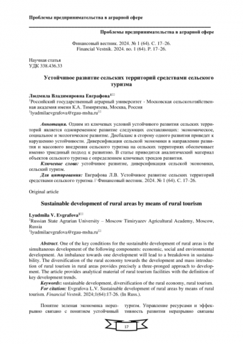 Transformation of socio-economic development scenarios of Russian rural areas in the context of globalization / L. Zaporozhtseva, D. Kleimenov, E. Kuznetsova [et al.] // IOP Conference Series: Earth and Environmental Science: The proceedings of the conference AgroCON-2019, Kurgan, 18-19 апреля 2019 года. Vol. 341. - Kurgan: IOP Publishing Ltd, 2019. - P. 012029. DOI: 10.1088/1755-1315/341/1/012029 EDN: KMKSWA