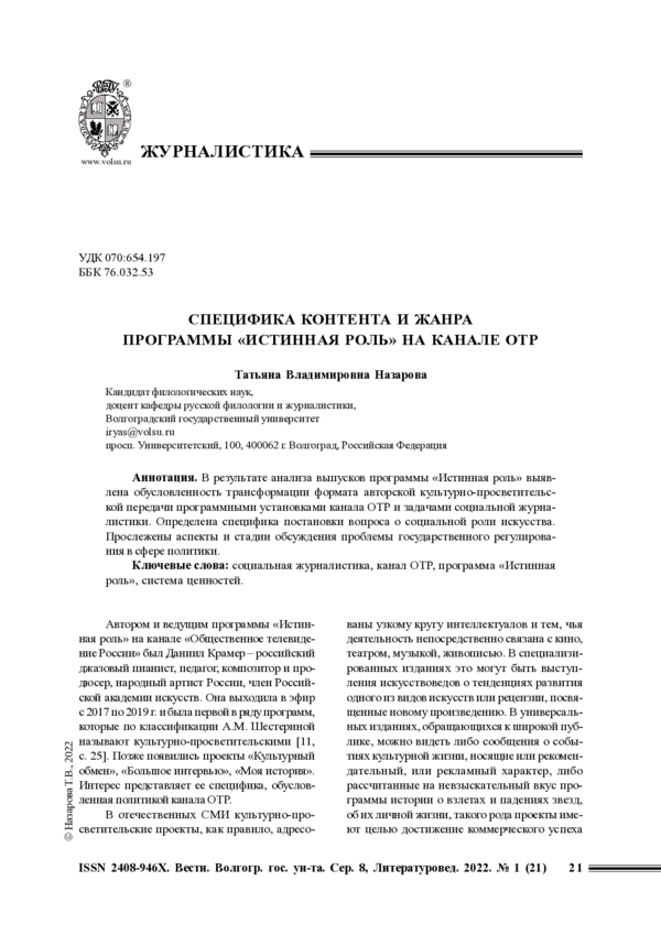 Назарова, Т. В. Функциональная специфика канала “Общественное телевидение России” / Т. В. Назарова // Вестник Волгоградского госуниверситета. Серия 8, Литературоведение. - 2021. - № 1 (20). - С. 52-59.