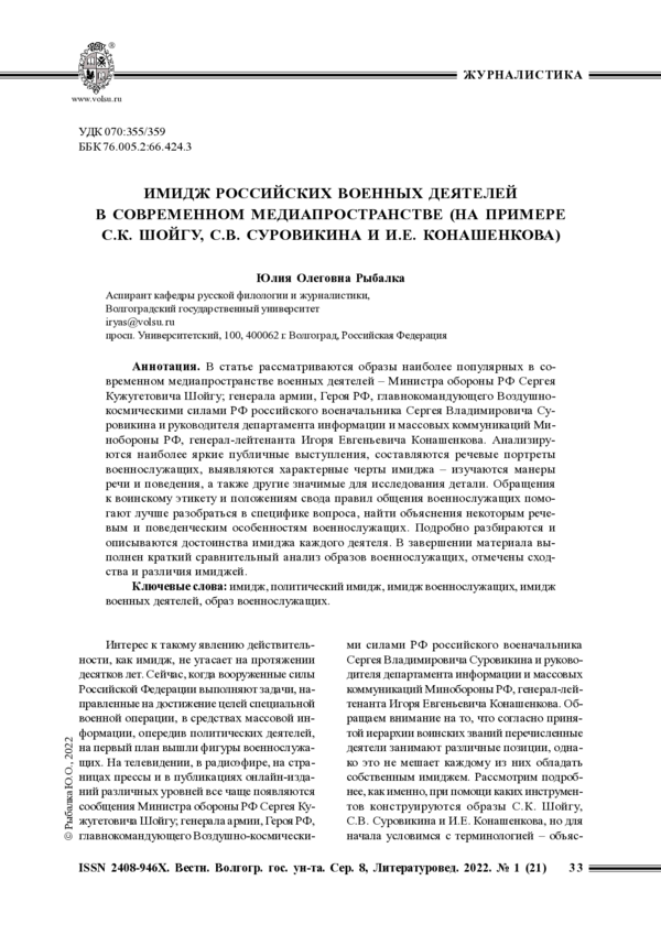 РЫБАЛКА Ю. О. ИМИДЖ РОССИЙСКИХ ВОЕННЫХ ДЕЯТЕЛЕЙ В СОВРЕМЕННОМ МЕДИАПРОСТРАНСТВЕ (НА ПРИМЕРЕ С.К. ШОЙГУ, С.В. СУРОВИКИНА И И.Е. КОНАШЕНКОВА) // ВЕСТНИК ВОЛГОГРАДСКОГО ГОСУДАРСТВЕННОГО УНИВЕРСИТЕТА. СЕРИЯ 8: ЛИТЕРАТУРОВЕДЕНИЕ. ЖУРНАЛИСТИКА. 2022. № 1