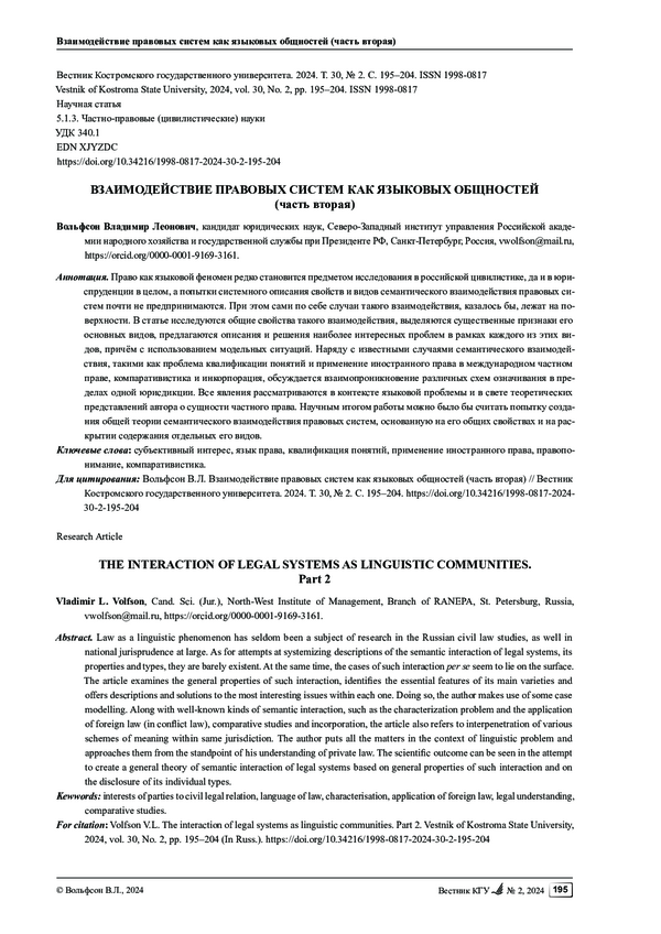 Вольфсон В.Л. Взаимодействие правовых систем как языковых общностей (ч. 1-я) // Вестник Костромского государственного университета. 2024. Т. 29, № 1. С. 213-221.