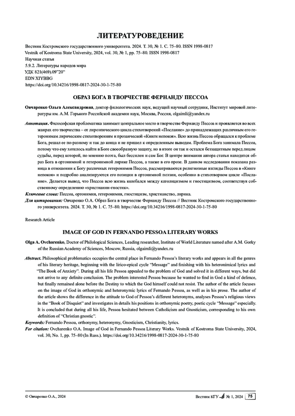Философская проблематика занимает центральное место в творчестве Фернанду Пессоа и проявляется во всех жанрах его творчества - от лироэпического цикла стихотворений «Послание» до принадлежащих различным его гетеронимам лирическим стихотворениям и прозаической «Книги непокоя». Всю жизнь Пессоа обращался к проблеме Бога, решал ее по-разному и так до конца и не пришел к определенным выводам. Проблема Бога занимала Пессоа, потому что ему хотелось найти в Боге своеобразную защиту, но в итоге он так и остался беззащитным перед лицом судьбы, перед которой, по мнению поэта, был бессилен и сам Бог. В центре внимания авторa статьи находится образ Бога в ортонимной и гетеронимной лирике Пессоа, а также в его прозе. В данном исследовании показана разница в отношении к Богу различных гетеронимов Пессоа, рассматриваются религиозные взгляды Пессоа в «Книге непокоя» и подробно анализируются его позиции в ортонимной поэзии, особенно в стихотворном цикле «Послание ». Делается вывод, что Пессоа всю жизнь колебался между католицизмом и гностицизмом, соответствуя собственному определению «христианин-гностик».