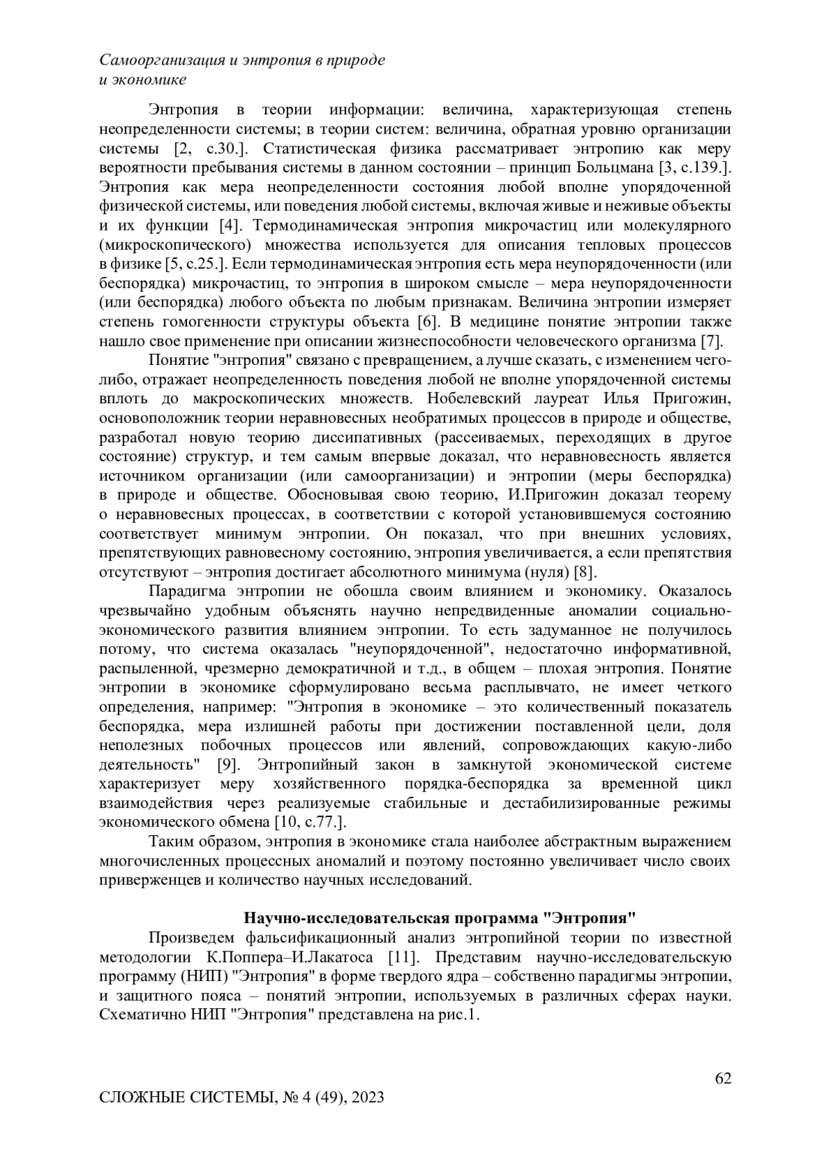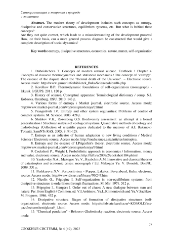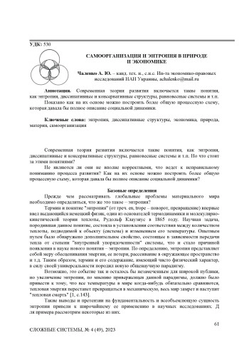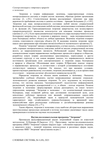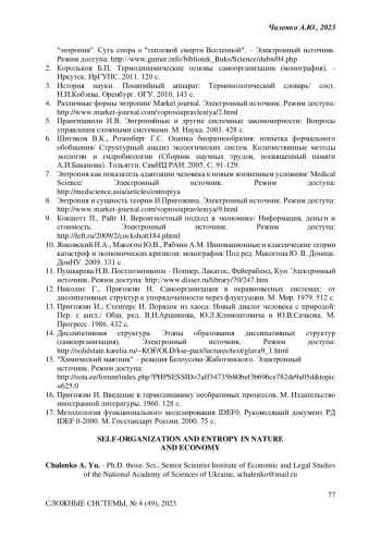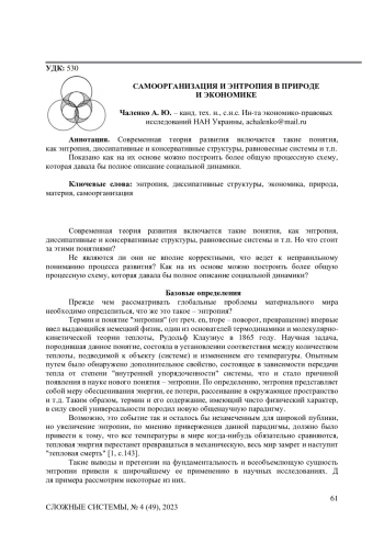 ЧАЛЕНКО А. Ю. САМООРГАНИЗАЦИЯ И ЭНТРОПИЯ В ПРИРОДЕ И ЭКОНОМИКЕ // СЛОЖНЫЕ СИСТЕМЫ. 2023. № 4 (49)