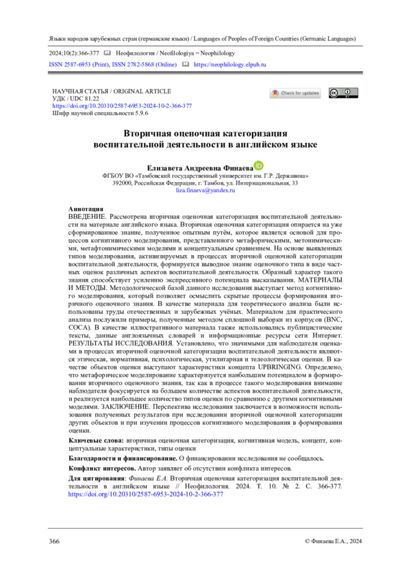 ВВЕДЕНИЕ. Рассмотрена вторичная оценочная категоризация воспитательной деятельности на материале английского языка. Вторичная оценочная категоризация опирается на уже сформированное знание, полученное опытным путём, которое является основой для процессов когнитивного моделирования, представленного метафорическими, метонимическими, метафтонимическими моделями и концептуальным сравнением. На основе выявленных типов моделирования, активизируемых в процессах вторичной оценочной категоризации воспитательной деятельности, формируется выводное знание оценочного типа в виде частных оценок различных аспектов воспитательной деятельности. Образный характер такого знания способствует усилению экспрессивного потенциала высказывания.