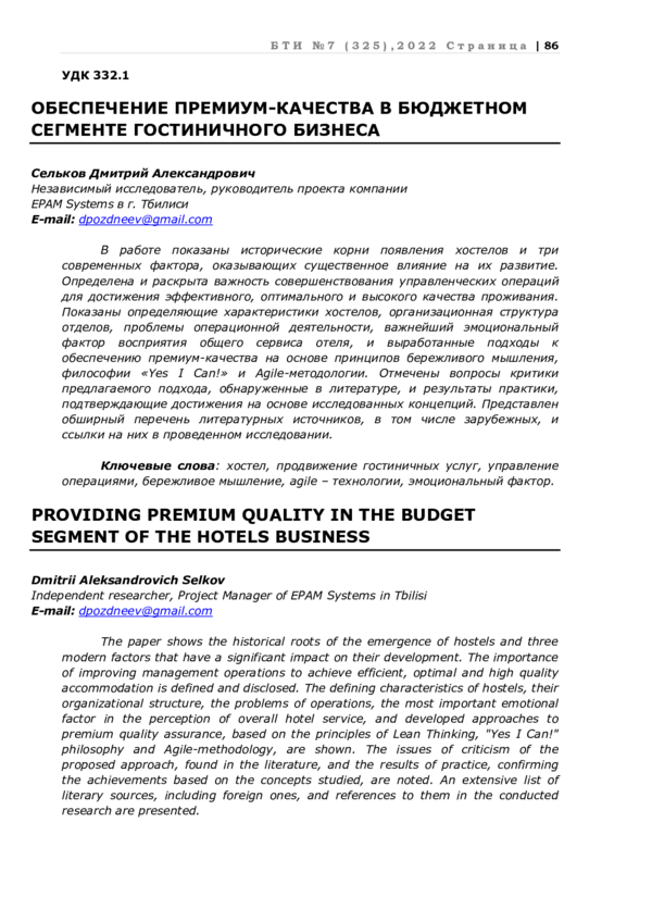 В работе показаны исторические корни появления хостелов и три современных фактора, оказывающих существенное влияние на их развитие. Определена и раскрыта важность совершенствования управленческих операций для достижения эффективного, оптимального и высокого качества проживания. Показаны определяющие характеристики хостелов, организационная структура отделов, проблемы операционной деятельности, важнейший эмоциональный фактор восприятия общего сервиса отеля, и выработанные подходы к обеспечению премиум-качества на основе принципов бережливого мышления, философии «Yes I Can!» и Agile-методологии. Отмечены вопросы критики предлагаемого подхода, обнаруженные в литературе, и результаты практики, подтверждающие достижения на основе исследованных концепций. Представлен обширный перечень литературных источников, в том числе зарубежных, и ссылки на них в проведенном исследовании.