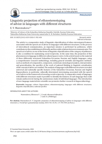 Статья представляет собой компаративное исследование лингвистической объективации этностереотипных особенностей, связанных с речевым актом советования в языках с различной структурой. В процессе межкультурного общения важную миссию выполняет вежливость, способствующая установлению дружеских и благоприятных отношений между коммуникантами. Речевой акт советования как одна из форм лингвистической объективации категории вежливости выступает также условием поддержания социальной взаимности. При этом проекция этого феномена в языке в различных культурных пространствах варьируется. В статье на материале трёх разноструктурных языков (кабардино-черкесского, русского и английского) с применением комплексной методики исследования, включающей общенаучные и собственно лингвистические методы, такие как методы сопоставительного, компонентного, контекстуального, этимологического анализа, интерпретации и обобщения, исследована специфика работы национального мышления при лингвистической актуализации понятия советования. Проведённый анализ разноструктурных языков выявил универсальные и национально специфичные черты кабардино-черкесской, русской и английской лингвокультур, в частности, культурно обусловленную стереотипизацию, сопряжённую с речевым актом советования в рамках обеспечения социальной взаимности. Сопоставительное исследование разноструктурных языков позволило выявить особенности каждого языка, которые могли остаться нераскрытыми при автономном изучении отдельных языков. Введение в научный оборот нового языкового материала содействует дальнейшим исследованиям в лингвокультурологии.