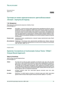 Цель работы - изучение системных связей ахроматического цветообозначения белый с другими цветообозначениями для определения особенностей концептуализации фрагмента цветового пространства в русской лингвокультуре. Анализ проводится на материале Национального корпуса русского языка. В качестве методов используются этимологический, лексикографический, корпусный, контекстуальный и концептуальный подходы, которые позволяют определить коллокации цветообозначений, классифицировать их по типу отношений, установить частотность сочетаемости и тематику, связывающую цветообозначения в рамках цветового пространства русской лингвокультуры.