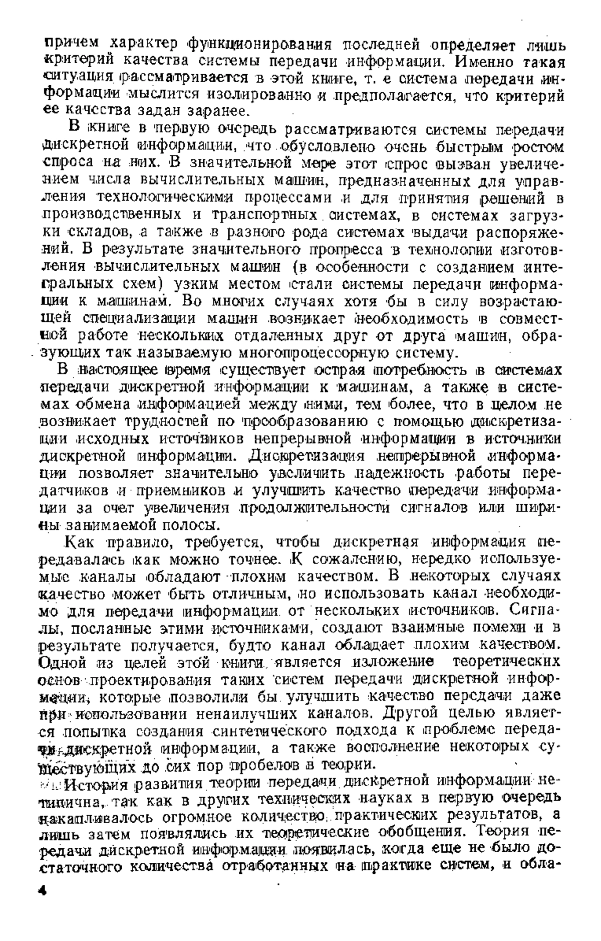 Монография посвящена вопросам теории систем передачи дискретной информации, которые приобретают все большее практическое значение в связи с возрастающим использованием цифровых электронных вычислительных машин. Рассматриваются принципы функционирования таких систем, вопросы оптимизации процессов передачи и приема сообщений. Дано систематическое изложение теории линейных, циклических и рекуррентных кодов, ортогональных, трансортогональных и биортогональных сигналов. Рассмотрены вопросы теории оптимального и субоптимального приема с простой реализацией, а также теории систем с обратной связью и систем со многими доступами. Книга предназначена для научных работников, а также для инженеров-разработчиков систем связи.