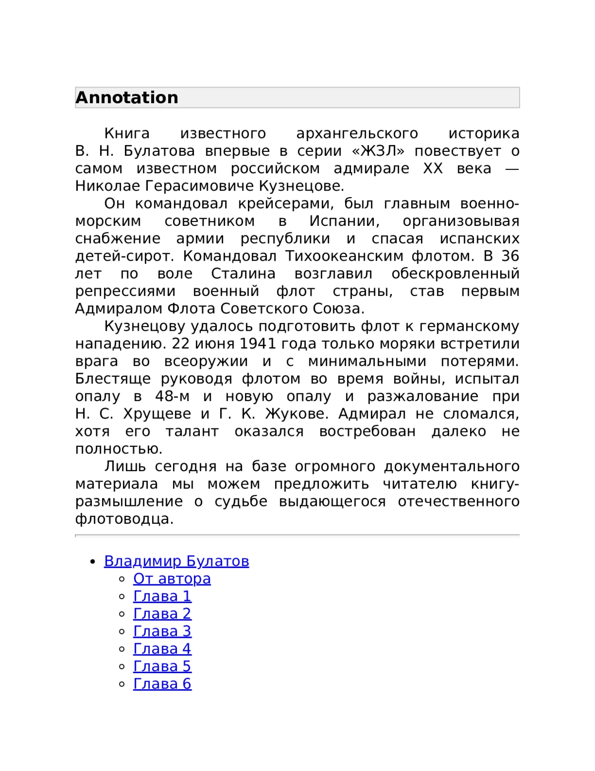 Книга известного архангельского историка В. Н. Булатова впервые в серии “ЖЗЛ” повествует о самом известном российском адмирале XX века - Николае Герасимовиче Кузнецове.