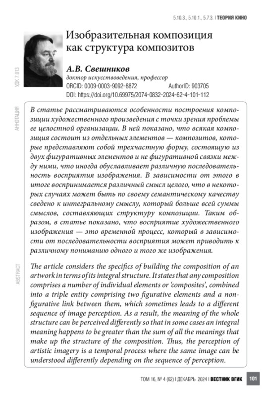 В статье рассматриваются особенности построения композиции художественного произведения с точки зрения проблемы ее целостной организации. В ней показано, что всякая композиция состоит из отдельных элементов — композитов, которые представляют собой трехчастную форму, состоящую из двух фигуративных элементов и не фигуративной связки между ними, что иногда обуславливает различную последовательность восприятия изображения. В зависимости от этого в итоге воспринимается различный смысл целого, что в некоторых случаях может быть по своему семантическому качеству сведено к интегральному смыслу, который больше всей суммы смыслов, составляющих структуру композиции. Таким образом, в статье показано, что восприятие художественного изображения — это временно́й процесс, который в зависимости от последовательности восприятия может приводить к различному пониманию одного и того же изображения.