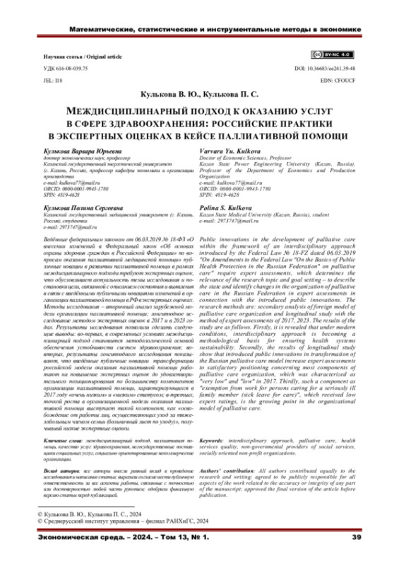 Статья: МЕЖДИСЦИПЛИНАРНЫЙ ПОДХОД К ОКАЗАНИЮ УСЛУГ В СФЕРЕ ЗДРАВООХРАНЕНИЯ: РОССИЙСКИЕ ПРАКТИКИ В ЭКСПЕРТНЫХ ОЦЕНКАХ В КЕЙСЕ ПАЛЛИАТИВНОЙ ПОМОЩИ