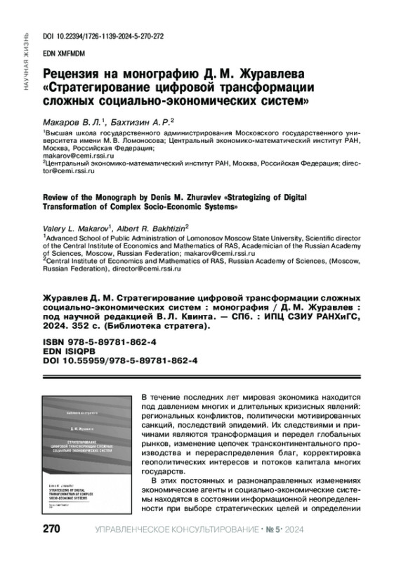 Статья: РЕЦЕНЗИЯ НА МОНОГРАФИЮ Д. М. ЖУРАВЛЕВА "СТРАТЕГИРОВАНИЕ ЦИФРОВОЙ ТРАНСФОРМАЦИИ СЛОЖНЫХ СОЦИАЛЬНО-ЭКОНОМИЧЕСКИХ СИСТЕМ"