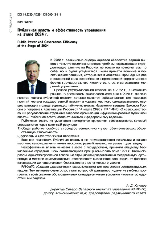 Статья: ПУБЛИЧНАЯ ВЛАСТЬ И ЭФФЕКТИВНОСТЬ УПРАВЛЕНИЯ НА ЭТАПЕ 2024 Г.
