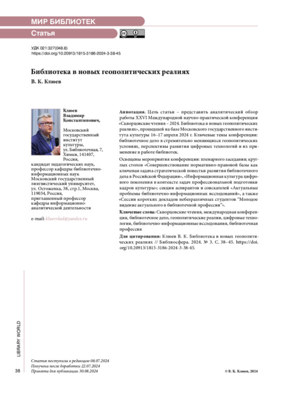 Цель статьи – представить аналитический обзор работы XXVI Международной научно-практической конференции «Скворцовские чтения – 2024. Библиотека в новых геополитических реалиях», прошедшей на базе Московского государственного института культуры 16–17 апреля 2024 г. Ключевые темы конференции: библиотечное дело в стремительно меняющихся геополитических условиях, перспективы развития цифровых технологий и их применение в работе библиотек.